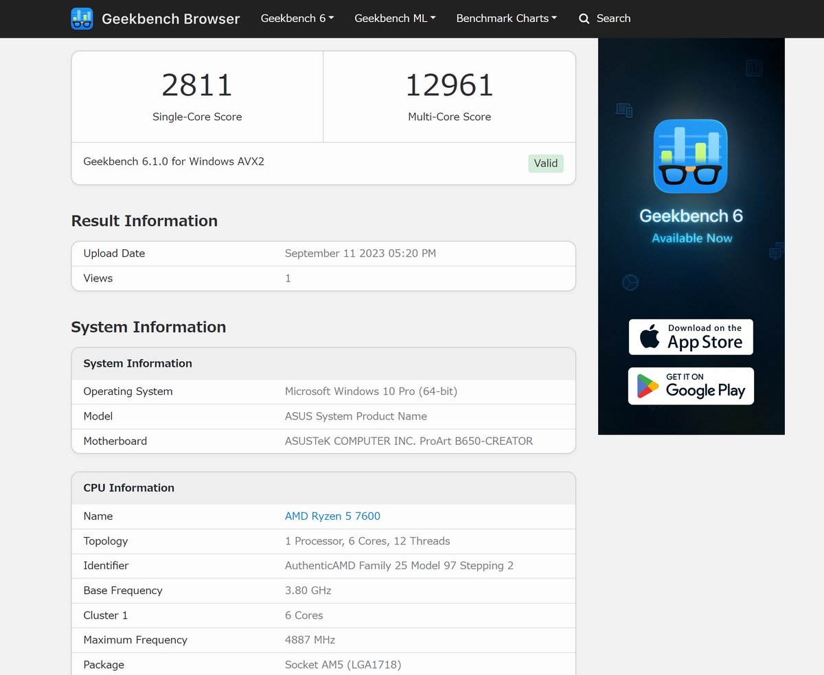 Geekbench 6 (Single-Core Score 2811, Multi-Core Score 12961)